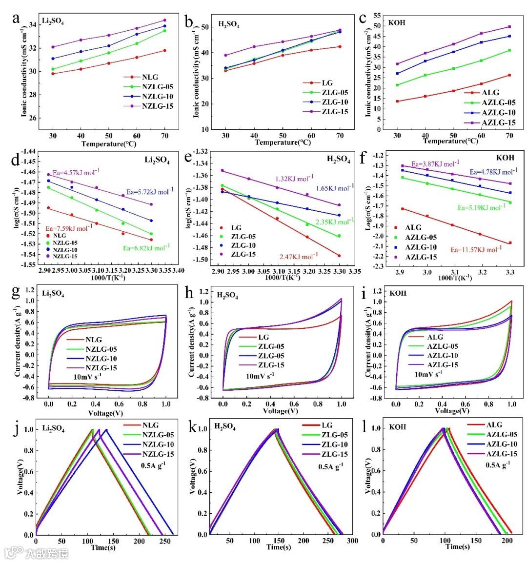 图4. 30°C到70°C温度范围内的离子导电性:(a) 中性GPEs,(b) 酸性GPEs,(c) 碱性GPEs。Arrhenius图:(d) 中性GPEs,(e) 酸性GPEs,(f) 碱性GPEs。在10 mV s-1下的CV曲线:(g) 中性GPEs,(h) 酸性GPEs,(i) 碱性GPEs。在0.5 A g-1下的GCD曲线:(j) 中性GPEs,(k) 酸性GPEs,(l) 碱性GPEs。