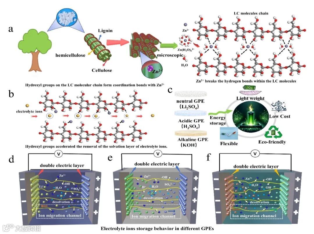 图1. (a) Zn2+打破LC分子链之间的氢键。(b) -OH基团去除LC分子链上水分子的溶剂化作用。(c) 用于EDLC应用的不同pH值的GPE。电解质离子储存行为:(d) 在中性GPE中。(e) 在酸性GPE中。(f) 在碱性GPE中。