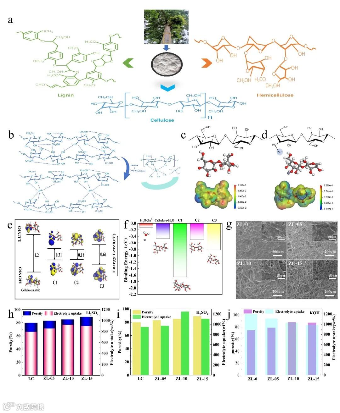 图2. (a) 木质纤维素结构示意图。(b) Zn2+与纤维素的配位机制。(c) 纤维素基体的MESP。(d) Zn2+与纤维素基体C1位点的-OH基团配位后的MESP。(e)Zn2+与纤维素基体不同C位点的羟基配位后的HOMO/LUMO能级及能隙(ΔE)计算结果。f) Zn2+与纤维素基体不同C位点的-OH基团配位结合能。(g) 不同Zn2+比例的LC膜的SEM图像。不同Zn2+比例的LC膜的吸水率和孔隙率:(h) 1M Li2SO4电解液。(i) 1M H2SO4电解液。(j) 6M KOH电解液。