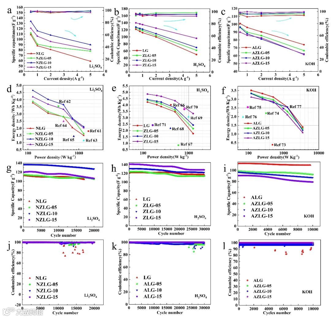 图5. 不同电流密度下的比电容和库仑效率:(a) 中性GPEs,(b) 酸性GPEs,(c) 碱性GPEs。能量密度和功率密度:(d) 中性GPEs,(e) 酸性GPEs,(f) 碱性GPEs。(g) 中性GPE基EDLCs在1 A g-1下经过20,000次GCD循环后的循环性能。(h) 酸性GPE基EDLCs在1 A g-1下经过30,000次GCD循环后的循环性能。(i) 碱性GPE基EDLCs在1 A g-1下经过10,000次GCD循环后的循环性能。库仑效率:(j) 中性GPEs,(k) 酸性GPEs,(l) 碱性GPEs。