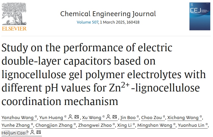 近日,来自西南石油大学的黄韵教授与王煦教授合作,在国际知名期刊Chemical Engineering Journal上发表题为“Study on the Performance of Electric Double-Layer Capacitors based on Lignocellulose Gel Polymer Electrolytes with Different pH Values for Zn2+-Lignocellulose Coordination Mechanism”的观点文章。该观点文章探究了导电GPE的各类优异特性,探讨了Zn2+与GPE基体LC分子中的-OH基团配位机制对不同类型电解质离子迁移的影响。通过不同pH值的GPE优化了双电层电容器(EDLC)的电化学性能,为开发高效、环保的电化学储能系统提供了理论和实验支持。