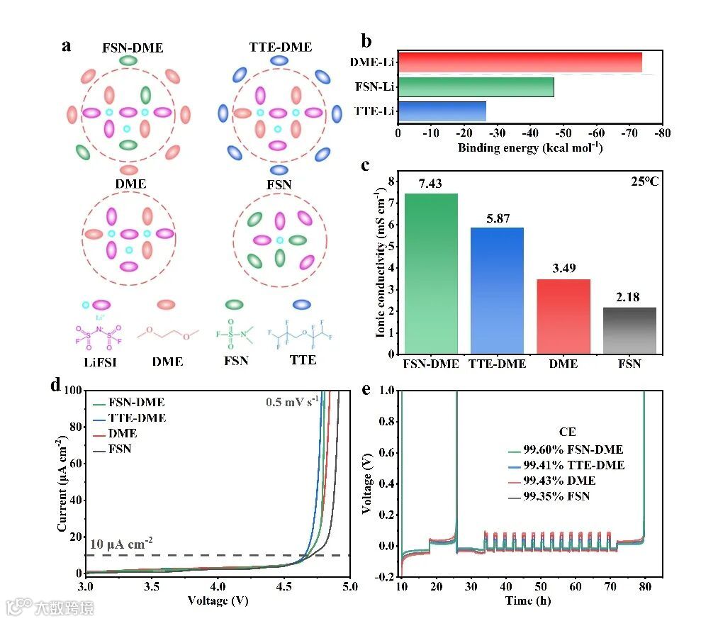 值得注意的是,FSN-DME 电解液的第一溶剂化鞘中 DME 含量较少,有助于降低溶剂衍生的副反应对锂负极和高电压正极的影响,这同样得益于 FSN 分子的协同配位作用。