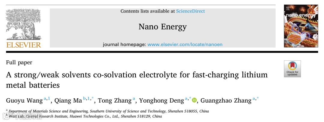 Wang, G., Ma, Q., Zhang, T., Deng, Y., & Zhang, G. (2025). A Strong/weak Solvents Co-Solvation Electrolyte for Fast-charging Lithium Metal Batteries. Nano Energy, 111064.