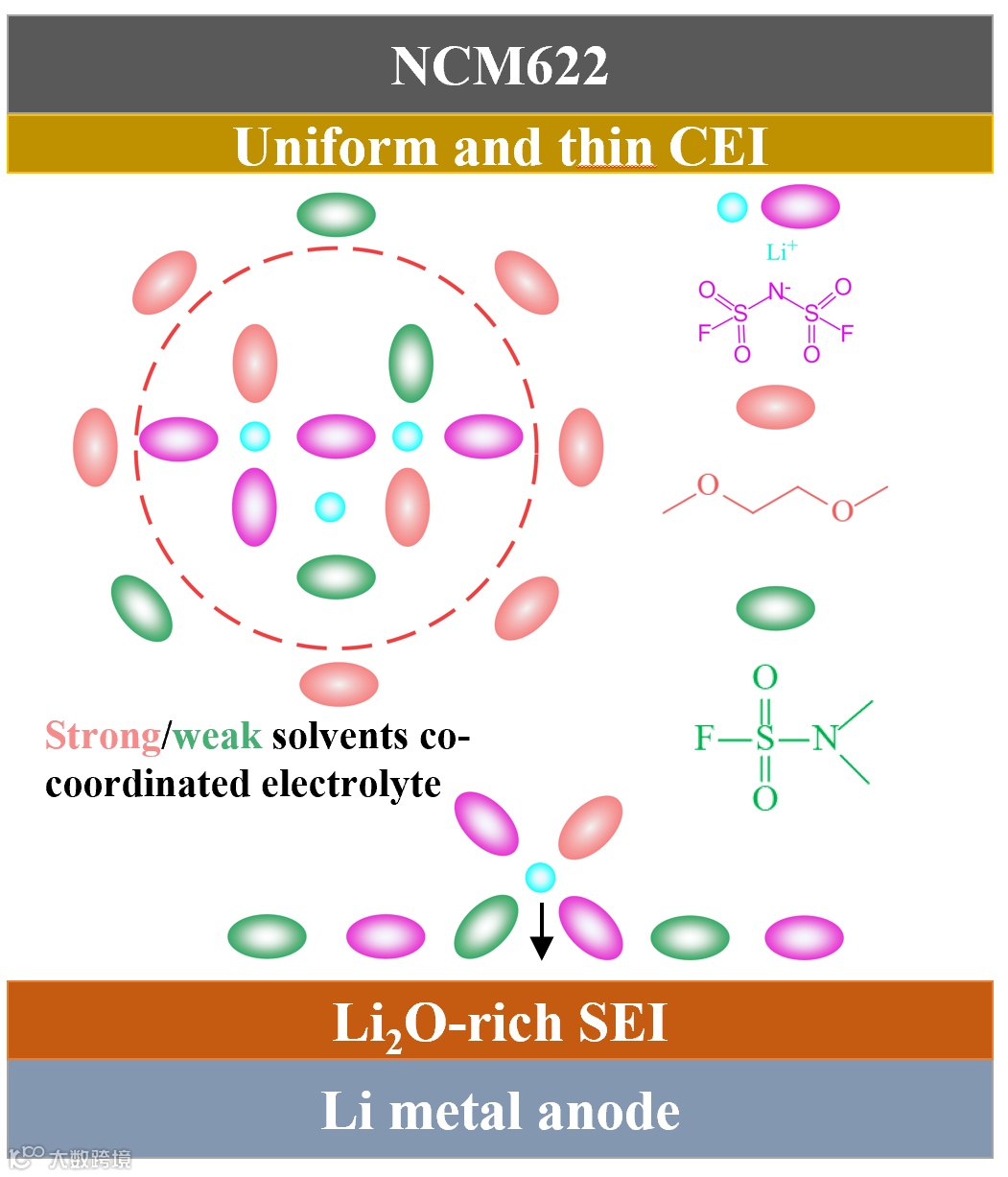 图1. 强/弱溶剂共溶剂化电解液调控溶剂化结构以定制氧化锂主导的富含无机物SEI的示意图。