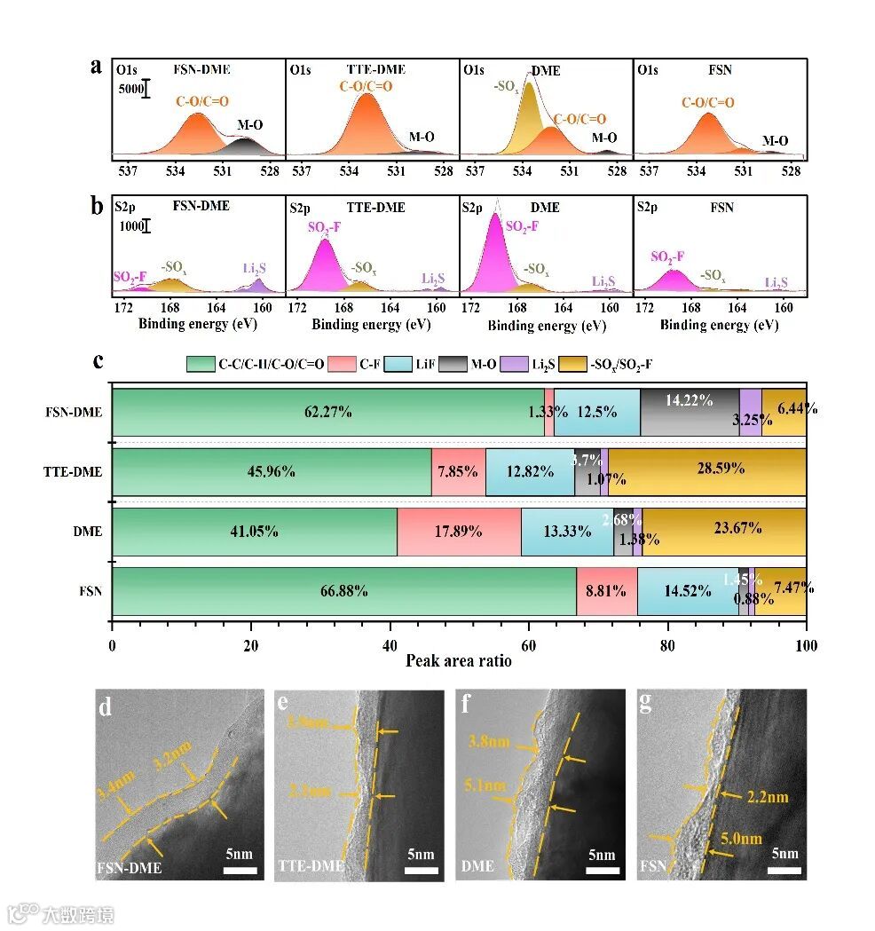 此外,我们还收集了不同电解液条件下循环后的锂金属的 S 2p 光谱进行进一步分析,其中 168 eV 附近的 -SOx 特征峰归属于 FSI- 阴离子(图 5b)。与对照电解液组别相比,FSN-DME 电解液中的 SEI 层中 -SOₓ 含量较少,这表明该电解液能够更多地还原阴离子,并形成稳定的保护层。不同电解液条件下循环的 SEI 层的各组分比例总结于图 5c。总体而言,在 FSN-DME 电解液条件下循环的锂金属 SEI 层中Li2O占据主导地位,相较于对照电解液,其比例也更高。