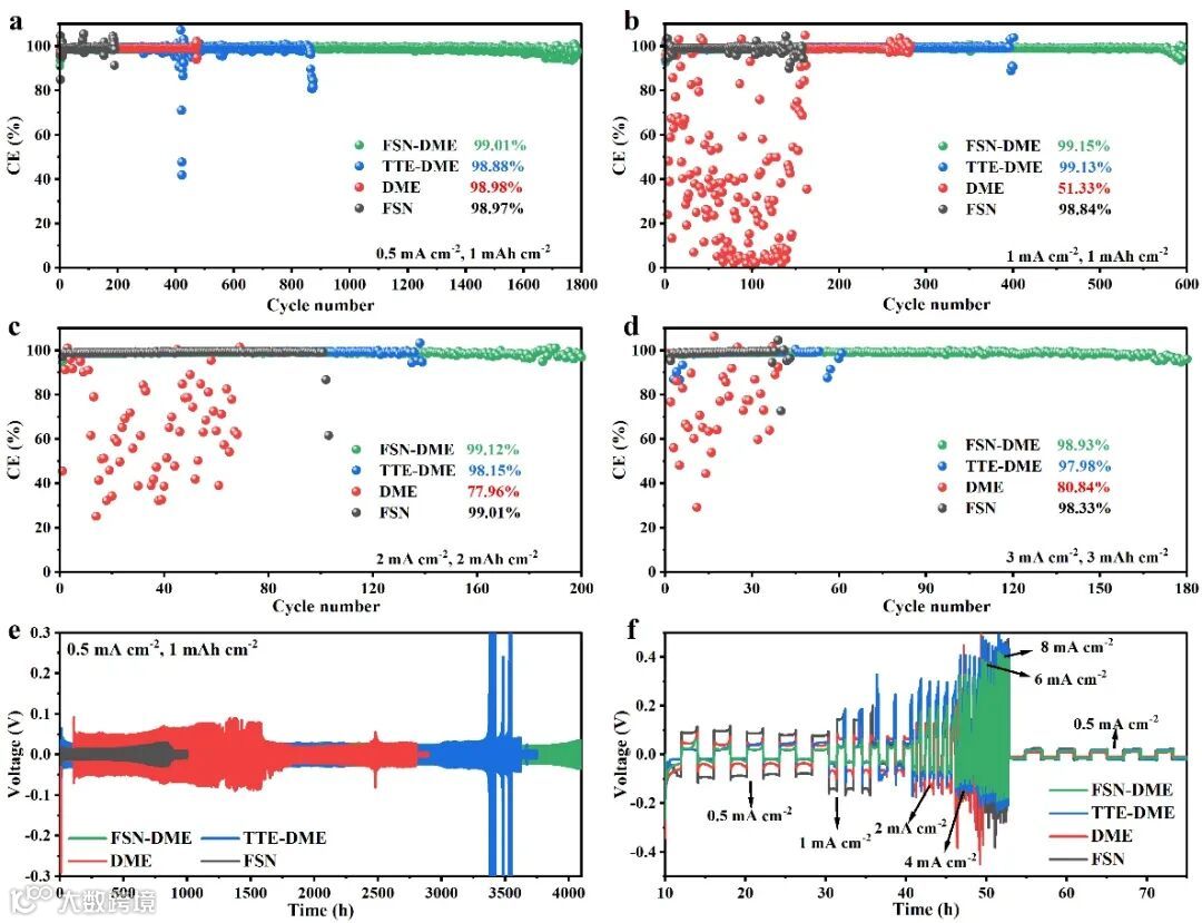为了进一步评估不同电解质的对锂稳定性,我们组装了Li||Cu纽扣电池,并测量了在不同电流密度下,铜集流体上的完整沉积/剥离可逆性。如图3a所示,使用FSN-DME的Li||Cu纽扣电池可以在0.5 mA cm-2的电流密度下(容量:1 mAh cm-2)稳定运行超过1600次循环,平均库仑效率(CE)>99%。相比之下,使用TTE-DME、DME和FSN电解质的电池分别仅能维持900次、450次和200次循环,且CE也低于FSN-DME(TTE-DME、DME和FSN电解质的CE分别为98.88%、98.98%和98.97%)。此外,FSN-DME电池的最低过电位(65 mV)表明其极化较小,这可能归因于其较高的离子电导率和优异的迁移数。当电流密度增加到1 mA cm-2时,使用FSN-DME的电池也能稳定运行超过580次循环,并具有更高的平均CE,达到99.15%(图3b),这也远高于使用对照组别电解质的电池。值得注意的是,在更高电流密度和更大沉积容量下,由不均匀沉积和副反应引发的锂枝晶生长将加速,从而导致锂负极较差的倍率性能。为了进一步突出我们的FSN-DME电解质的优异倍率性能,我们还在更高的电流密度和更大的沉积容量下测试了Li||Cu纽扣电池的锂的沉积/剥离行为。如图3c所示,使用FSN-DME电解质的电池可以在2 mA cm-2的电流密度下(容量:2 mAh cm-2)稳定工作超过200次循环,平均CE高达99.12%,而使用TTE-DME和FSN的电池分别只能实现130次和90次循环。