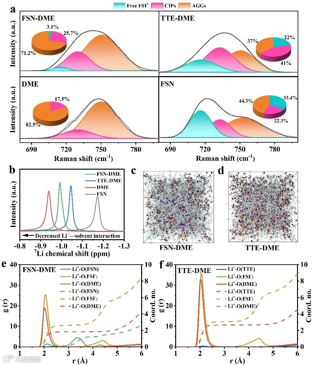 为了进一步确定 FSN 对溶剂化结构的影响,我们对 FSN-DME 和 TTE-DME 电解液进行了分子动力学(MD)模拟。通过捕获 FSN-DME 和 TTE-DME 电解液在 50 ns 时刻的模拟图及锂离子配位结构图(图 7c-d),可以看出 FSN-DME 电解液的溶剂化簇更密集,表明其溶剂化结构中的阴离子比例更高。从配位结构图可以观察到,FSN-DME 电解液的溶剂化结构主要为 AGGs,而 TTE-DME 电解液则主要由 CIPs 组成,这一结果与先前的 Raman 光谱分析一致。