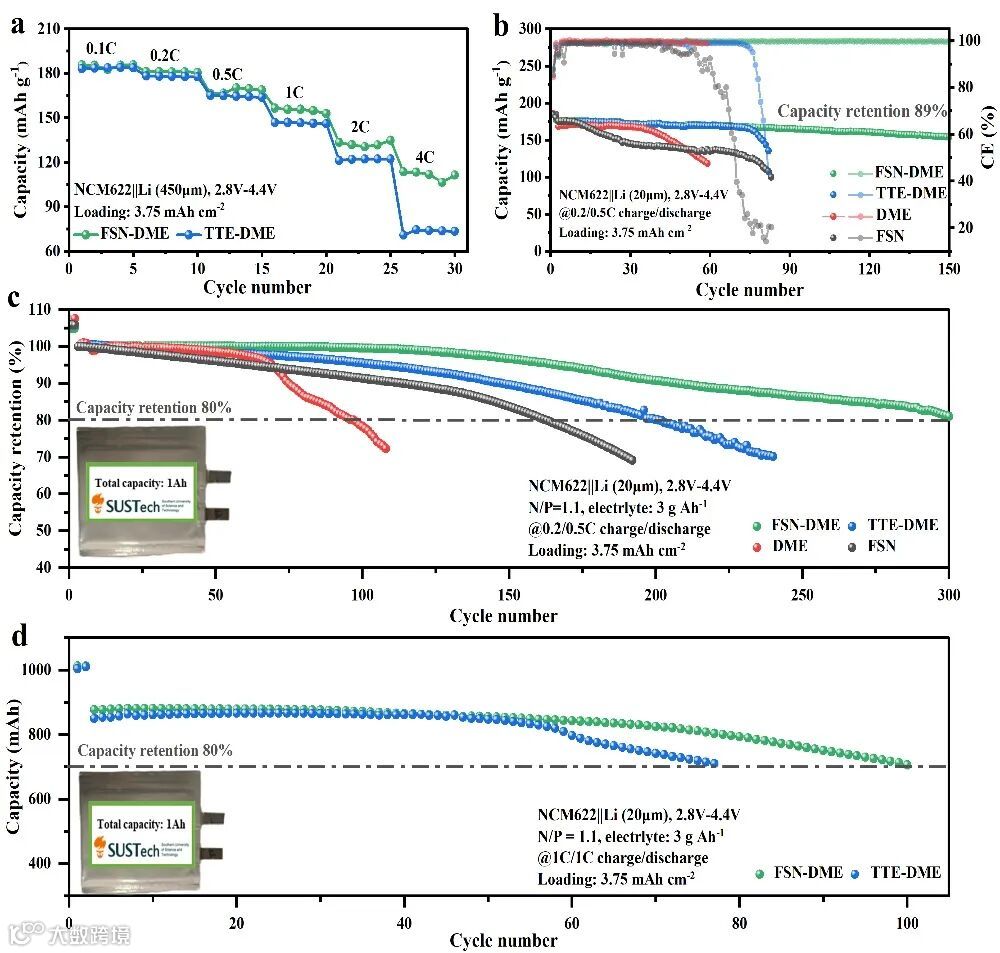 在 0.2/0.5C 的充放电速率下,FSN-DME 可使 1 Ah 软包电池在超过 300 次循环后仍保持稳定运行,容量保持率达 80%,同时初始库仑效率(CE)高达 91.4%(图4c)。相比之下,TTE-DME、DME 和 FSN 电解液的电池仅分别维持 200、100 和 160 次循环。高倍率充放电(例如 ≥1C)、高质量负载 NCM622||Li 以及高截止电压(4.4 V)是电解液面临的重大挑战,而即使是最先进的电解液,如高浓电解液(HCEs)、局部高浓电解液(LHCEs)以及弱溶剂化电解液,都难以满足这些要求。