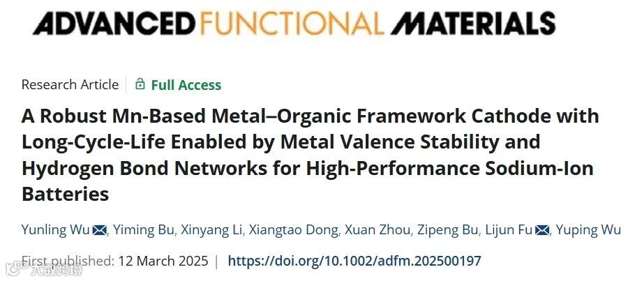 基于此,来自南京工业大学大学的邬赟羚副教授和付丽君教授,在国际知名期刊Advanced Functional Materials上发表题为“A Robust Mn-Based Metal–Organic Framework Cathode with Long-Cycle-Life Enabled by Metal Valence Stability and Hydrogen Bond Networks for High-Performance Sodium-Ion Batteries”的研究性文章。文章首次报道了一种基于锰离子与2,7-二羧基-芘-4,5,9,10-四酮(PTO-(COOH)2)配体构筑的三维金属有机框架材料(Mn-PTO),通过将氧化还原活性限制于配体羰基、稳定Mn2+价态与氢键网络的协同作用,实现了钠离子电池正极材料的高稳定性与长循环寿命。