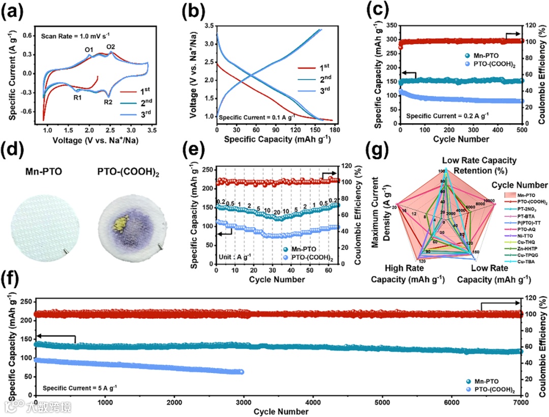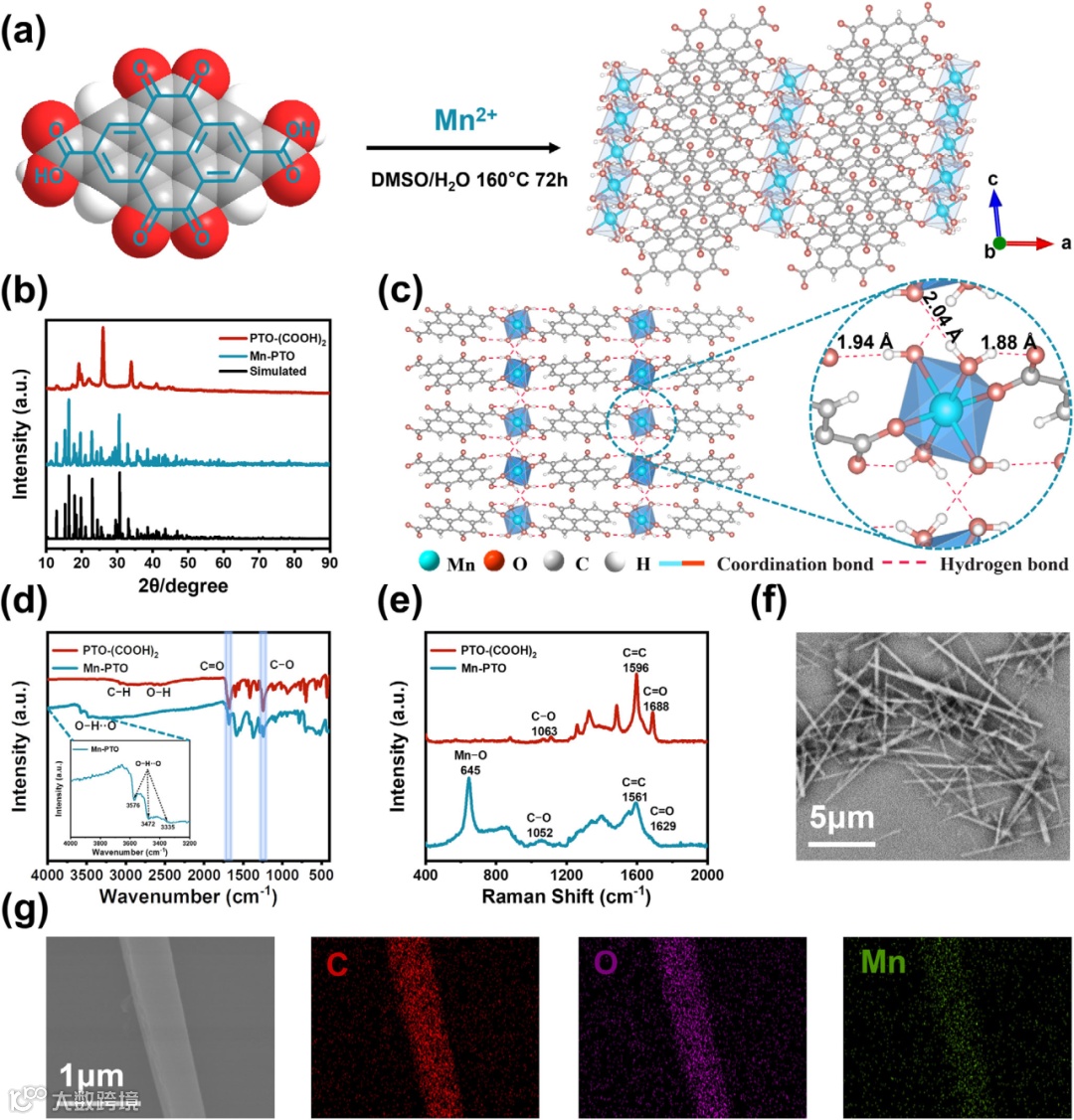 配体主导氧化还原:通过在PTO对位设计羧基,作为金属连接位点,避免Mn2+价态变化,结合六配位Mn-O八面体结构(“三维螯合效应”),确保金属节点在循环中的化学惰性。