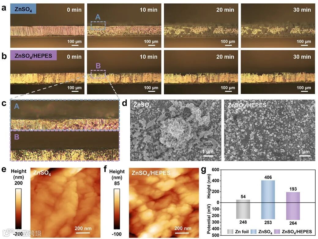 得益于重构的锌离子溶剂化鞘与自组装单分子层提供的充足成核位点,原位光学显微镜直观观察到HEPES加入后锌沉积的初期即呈现均匀成核特征,后续始终保持致密平整的沉积形貌。并且通过原子力显微镜和开尔文探针力显微镜进一步揭示了由于HEPES的磺酸基团优先吸附于锌负极表面,配合单分子层重构的电位分布,最终恢复了热力学稳定的(002)晶面择优取向沉积。