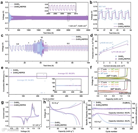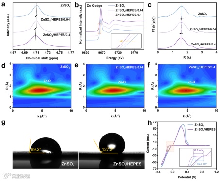 通过核磁共振技术和X射线吸收近边结构进一步解析了电解液中HEPES与锌离子的相互作用机制。HEPES作为电子给体显著改变了锌离子的局域配位环境,因此HEPES的引入可重构锌离子初级溶剂化鞘结构,有效减少自由水分子数量并降低后续锌离子的脱溶剂化能垒。
