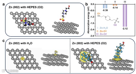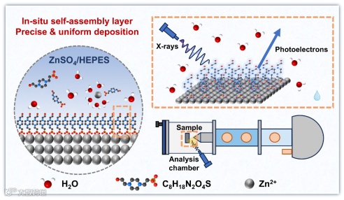 基于此,来自苏州大学的张亮、浙江大学的刘铁峰与上海科技大学的韩永合作,在国际知名Advanced Functional Materials期刊上发表题为“In-situ Molecular Self-Assembly for Dendrite-Free Aqueous Zn-ion Batteries”的观点文章。该观点文章提出了一种原位分子自组装策略,在锌负极表面构建坚固且自修复的单分子层以调控锌电沉积行为。通过密度泛函理论计算和原位近常压硬X射线光电子能谱表征发现,电解液添加剂4-(2-羟乙基)-1-哌嗪乙磺酸(HEPES)能够凭借磺酸基团与锌原子间的强化学作用,自发吸附在锌负极表面形成有序单分子层。此外,HEPES对锌离子溶剂化鞘的调控作用与自组装层的疏水性协同抑制了界面水介导的副反应,改善了锌离子沉积/溶解动力学,有效抑制了锌枝晶生长。