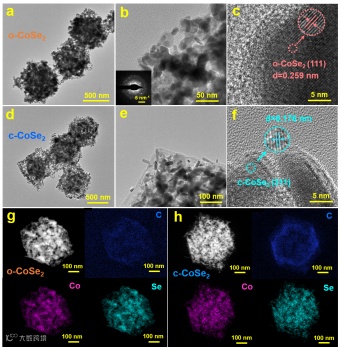 图3 o-CoSe2的(a,b)TEM和(c)HRTEM图像;c-CoSe2的(d,e)TEM和(f)HRTEM图像;(g) o-CoSe2和(h) c-CoSe2的EDS元素分布图。