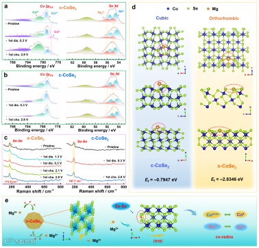 图6 (a,b)非原位XPS谱;(c)非原位拉曼光谱;(d) Mg原子吸附在立方相和正交相CoSe2(010)晶面的结构与形成能;(e) 正交相CoSe2促进Mg²⁺扩散及阴/阳离子协同氧化还原的机理示意图。