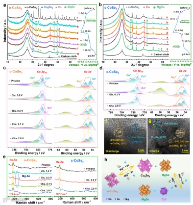 图5 (a,b) 非原位XRD;(c,d) 非原位XPS;(e) 非原位拉曼光谱;(f,g) 非原位HRTEM;(h) o-CoSe2的镁存储机制示意图。