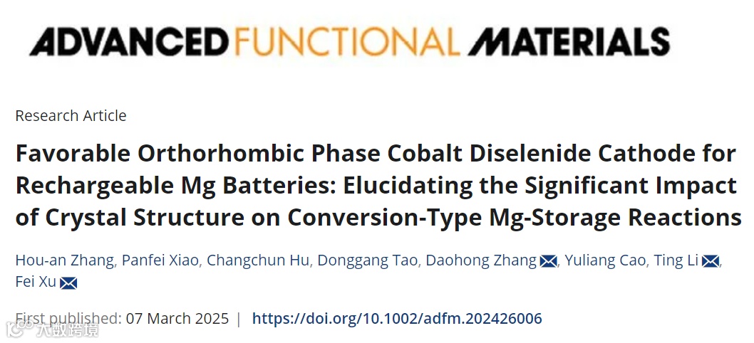 中南民族大学李婷、张道洪/武汉大学徐飞团队在国际知名期刊Advanced Functional Materials上发表题为“Favorable Orthorhombic Phase Cobalt Diselenide Cathode for Rechargeable Mg Batteries: Elucidating the Significant Impact of Crystal Structure on Conversion-Type Mg-Storage Reactions”的研究论文。本文合成了正交相与立方相CoSe2,研究发现尽管o-CoSe2的比表面积更低,但其储镁容量、倍率性能和反应动力学显著优于c-CoSe2。结合机理表征与理论计算,揭示了正交相CoSe2的(010)晶面具有更高的反应活性及Se‒Se键的协同氧化还原机制,为设计高性能转换型储镁正极材料提供了新思路。