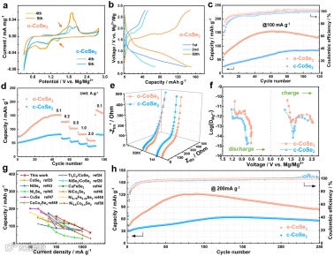 对比正交相(o-CoSe2)和立方相(c-CoSe2)的电化学储镁性能,o-CoSe2在CV曲线中表现出更高的氧化还原电流(含Se22‒/Se2‒特征峰),其初始放电容量139.9 mAh g‒1(c-CoSe2仅59.3 mAh g‒1),循环120周后容量保持率84.8%(c-CoSe2容量衰减显著)。进一步分析显示,o-CoSe2的正交相结构通过促进Co3+/Co2+/Co0和Se22‒/Se2‒多步氧化还原反应,显著提升了储镁活性。以上结果说明了CoSe2晶体结构差异对储镁活性的显著影响。