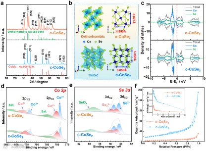 图2 o-CoSe2和c-CoSe2的(a) XRD图谱;(b) 晶体结构;(c) 态密度;(d) Co 2p和(e) Se 3d的XPS谱;(f) 氮气吸附-脱附等温线及孔径分布。