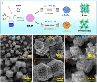 图1 (a) 合成过程示意图。(b, c) ZIF-67、(d, e) 正交相(o-CoSe2)和(f, g) 立方相(c-CoSe2)的SEM图像。