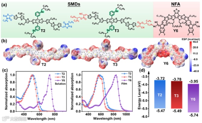 Fig. 1. a) Chemical structures, b) the electrostatic potential (ESP) distributions, c) UV−vis absorption spectra, and d) the corresponding energy levels diagram of T2, T3, and Y6.