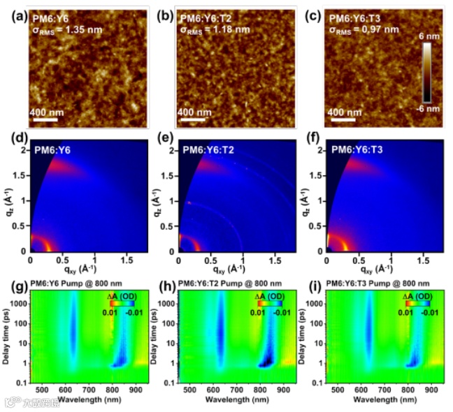 Fig. 5. a, b, c) The AFM height images; d, e, f) 2D GIWAXS patterns; g, h, i) 2D color plots of transient absorption spectroscopy under 800 nm excitation of PM6:Y6, PM6:Y6:T2 and PM6:Y6:T3 blend films.