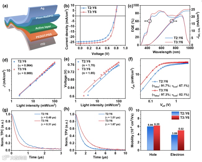 Fig. 2. a) Device structure of the ASM-OSCs employed in this study; b) J-V and c) EQE curves of the indicated devices; the d) I versus JSC values, e) I versus VOC, and f) Jph versus Veff plots of the indicated devices; g) transient photocurrent and h) transient photovoltage of T2:Y6 and T3:Y6 based devices; i) the hole mobility and electron mobility of corresponding T2:Y6 and T3:Y6 devices.