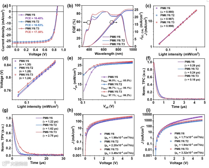 Fig. 4. a) Current density voltage (J-V) curves; b) EQE spectra and integrated JSC of corresponding devices; c) JSC versus light intensity of these devices; d) VOC versus light intensity of these devices; e) Jph–Veff relationships; f) Transient photocurrent decay curves; g) Transient photovoltage decay curves; The current density-voltage relationship for h) hole mobility and i) electron mobility of PM6:Y6, PM6:Y6:T2 and PM6:Y6:T3.
