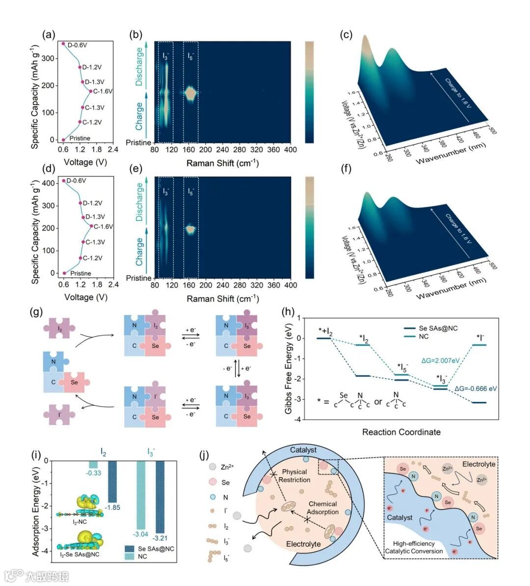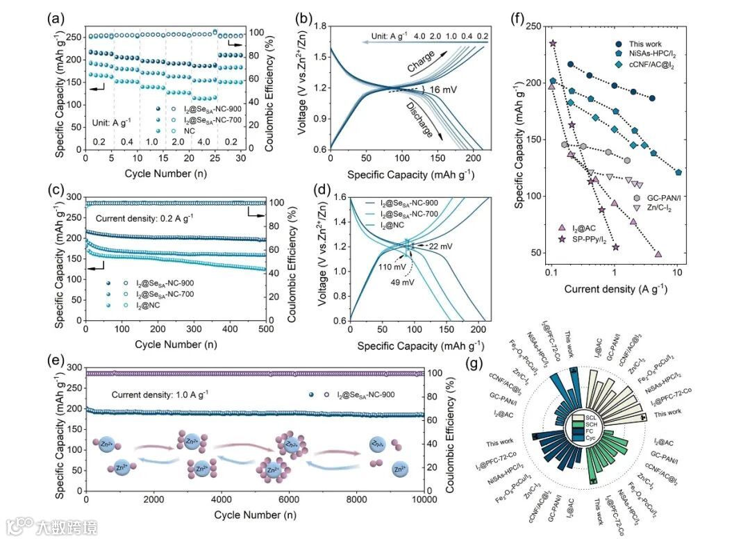 本文首次在水系锌-碘电池体系中探索了由ZIF-8衍生的、锚定半金属Se SAs位点的碳纳米材料对于碘催化转化的作用,通过多种测试表征了Se SAs的合成以及石墨N的的分布。其中Se SAs位点以C-Se-C的结构分布于缺陷处和边缘,其形成促进了多碘化物中间体的还原。同时,石墨N有利于多碘化物的吸附,并改善碘的转化反应动力学。Se SAs位点的存在和石墨N水平的升高将对碘的吸附和催化活性产生积极影响,从而可能抑制中间体的形成。