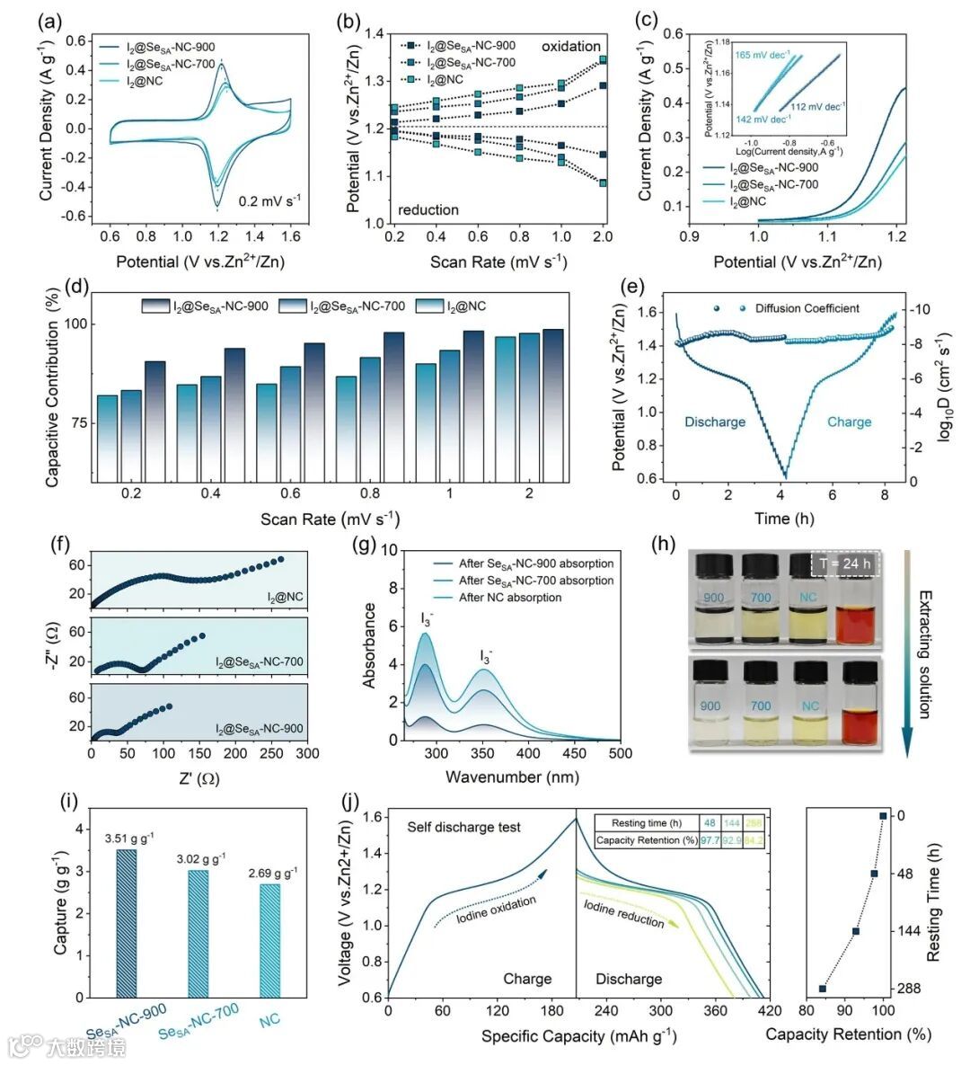 多种电化学测试表明,组装有I2@SeSANC-900正极的电池表现出明显优势的电化学反应动力学和离子扩散速率。此外,进一步通过实验验证所合成的三种催化剂中SeSA-NC-900相比于其他两个电极拥有最优的多碘化物中间体吸附能力,表明其在充放电过程中能够有效抑制穿梭效应的发生。所组装的电池表现出了优异的倍率性能和更稳定的循环过程,与其他文中列举的金属-碘电池相比具有明显的优势。