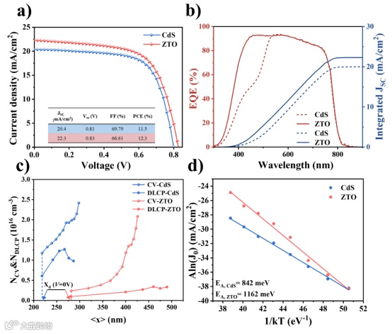 图8. a) 具有 CdS 和 ZTO 缓冲层的器件的光电流-电压 (J-V) 曲线,b) EQE 光谱,c) 器件的电容-电压 (C-V) 和深能级瞬态光电导 (DLCP) 曲线。d) 具有 CdS 和 ZTO 缓冲层的器件的复合激活能 (EA) 的线性拟合。