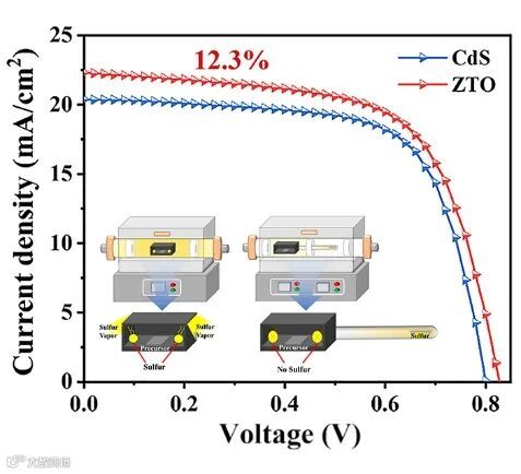 基于此,香港科技大学(广州)颜畅团队与深圳大学梁广兴研究员团队在材料,能源和物理领域顶刊Advanced Functional Materials(影响因子18.5,中科院一区,TOP期刊,自然指数期刊)发表题为:Manipulation of Morphology and Band Alignment Enables over 12% Efficient Wide-Bandgap Solution-Process Cu(In, Ga)S2 Solar Cells的最新论文研究,是目前溶液法制备铜铟镓硫太阳电池的最高效率,展现了无机宽带隙薄膜太阳电池在叠层太阳电池中的应用前景。该工作针对吸收层薄膜硫化过程中后期硫分压不足导致的吸收层硫化质量下降,深能级缺陷密度升高等关键问题,创新性地提出并采用了双温区硫化装置,对硫引入时机进行了精确调控,实现了硫的持续供给,制备得到结晶质量优异的吸收层薄膜;同时,充足的硫氛围诱导钠离子向表面迁移,在贫铜表面构建纳米级钠铟硫(NaInS2)过渡层,促使异质结能带结构从从单一高势垒(>0.4 eV)的悬崖型转变成两个低势垒的悬崖型(0.15 和0.31 eV),从而有效抑制太阳电池内部的载流子在异质结界面处的非辐射复合;另外,采用原子层沉积技术(ALD)制备锌锡氧(ZTO)代替传统的硫化镉(CdS)缓冲层构建无镉薄膜太阳电池,优化了载流子运输,使效率进一步提升;最后将基于大气环境下采用非真空溶液法的铜铟镓硫(带隙1.6 eV/无合金掺杂)太阳电池光电转换效率提升至12.3%。该工作展示了铜铟镓硫等无机宽带隙薄膜太阳电池作为顶电池与晶硅太阳电池作为底电池构建叠层太阳电池的良好前景。