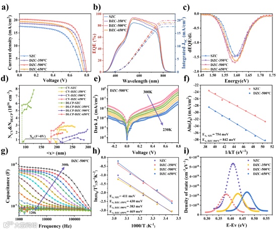 图7. a) 单温区硫化 SZC、双温区硫化 DZC-350℃、DZC-500℃ 和 DZC-650℃ 器件的光电流-电压 (J-V) 曲线,b) EQE 光谱,c) 从 EQE 光谱中得出的带隙,d) SZC、DZC-350℃、DZC-500℃ 和 DZC-650℃ 器件的电容-电压 (C-V) 和深能级瞬态光电导 (DLCP) 曲线。e) DZC-500℃ 器件在暗态下的 J-V-T 曲线。f) SZC 和 DZC-500℃ 器件的复合激活能 (EA) 的线性拟合。g) DZC-500℃ 器件的 admittance 光谱及相应的 h) 缺陷能级的 Arrhenius 图,以及 i) 所有器件的缺陷密度分布曲线。