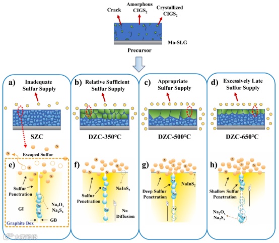 图6. a, e) 单温区硫化 (SZC) 方法的晶粒生长和自构建 NaInS₂ 形成机制示意图;b, f) 双温区硫化 (DZC-350℃) 方法的晶粒生长和自构建 NaInS₂ 形成机制示意图;c, g) 双温区硫化 (DZC-500℃) 方法的晶粒生长和自构建 NaInS₂ 形成机制示意图;d, h) 双温区硫化 (DZC-650℃) 方法的晶粒生长和自构建 NaInS₂ 形成机制示意图。