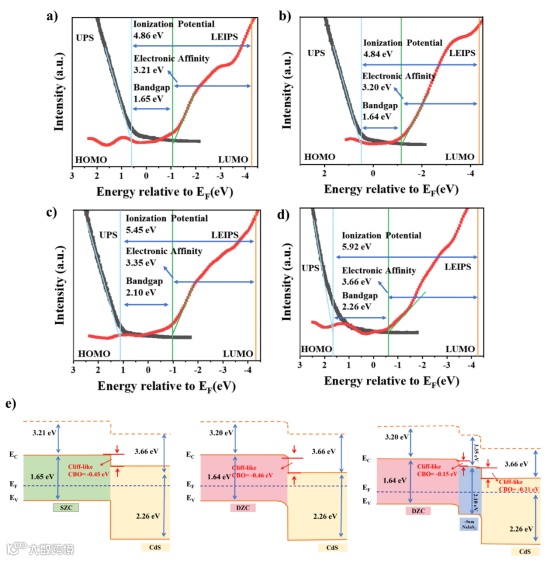 图5. a) 单温区硫化 (SZC) 的 UPS-LEIPS 光谱,b) 双温区硫化 (DZC-500℃) 的 UPS-LEIPS 光谱,c) 刻蚀 20nm 后 DZC-500℃ 吸收层的 UPS-LEIPS 光谱,d) CdS 缓冲层的 UPS-LEIPS 光谱。e) 吸收层与缓冲层之间的能带匹配示意图。