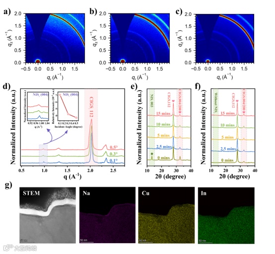 图4. 对于DZC-500℃ 样品,在不同的入射角a) 0.1°,b) 0.3°,c) 0.5° 下的 2D GIWAXS 图谱。d) 2D GIWAXS 图谱对应的 1D 线切割剖面。 不同刻蚀时间下, e) DZC-500℃ 和f) SZC 吸收层的 XRD 图谱。g) DZC-500℃ 样品表面附近的横截面 STEM 图像及映射分析。