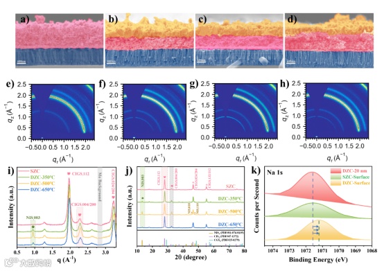 图3. a, e) 单温区硫化 (SZC) 的横截面扫描电镜 (SEM) 微观图及 2D GIWAXS 图谱,b, f) 双温区硫化 (DZC-350℃) 的横截面扫描电镜微观图及 2D GIWAXS 图谱,c, g) 双温区硫化 (DZC-500℃) 的横截面扫描电镜微观图及 2D GIWAXS 图谱,d, h) 双温区硫化 (DZC-650℃) 的横截面扫描电镜微观图及 2D GIWAXS 图谱。i) 对应的 1D 线切割剖面,j) 吸收层XRD 图谱。k) 有/无刻蚀 20nm的DZC-500℃ 样品的 Na 1s 峰的 XPS 光谱及 SZC 样品的 XPS 光谱。