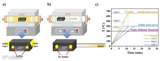 图2. 硫化装置优化图 a) 单温区硫化 (SZC),b) 双温区硫化 (DZC),c) 前驱体样品区域和硫源区域的退火曲线。