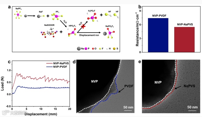 图1 (a) NaPF₆的反应机理及NaPVS粘结剂作用机制示意图 (b) 四点探针法测得的NVP-NaPVS与NVP-PVDF电极电阻对比 (c) NVP-PVDF和NVP-NaPVS电极的180°剥离-位移曲线 (d) NVP表面NaPVS粘结剂的TEM图像 (e) NVP表面PVDF粘结剂的TEM图像
