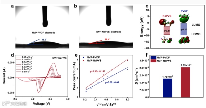 图2 (a) NVP-PVDF电极与(b) NVP-NaPVS电极对NaPF₆电解液的润湿性对比;(c) PVDF与NaPVS粘结剂的前线分子轨道(HOMO/LUMO)能量及化学硬度参数;(d) NVP-NaPVS电极在不同扫描速率(0.05–1.0 mV·s⁻¹)下的循环伏安曲线;(e) 循环伏安数据中峰值电流(Ip)与扫描速率平方根(v¹/²)的线性关系;(f) NVP-PVDF与NVP-NaPVS电极的钠离子表观扩散系数(D)对比。