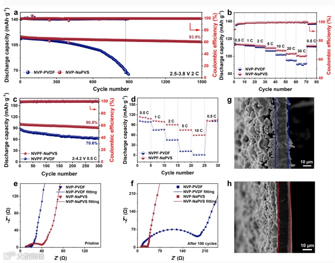 图3 (a) NVP-PVDF与NVP-NaPVS基电池在2 C倍率下的循环性能对比;(b) NVP-PVDF与NVP-NaPVS基电池的倍率性能测试;(c) NVPF-PVDF与NVPF-NaPVS基电池在0.5 C倍率下的循环性能对比;(d) NVPF-PVDF与NVPF-NaPVS基电池的倍率性能测试;(e) NVP-PVDF基电池和(f) NVP-NaPVS基电池在初始状态及循环100次后的电化学阻抗谱(Nyquist曲线)拟合分析;(g) NVP-PVDF基电池与(h) NVP-NaPVS基电池在2 C倍率下循环500次后的电极截面扫描电镜图像。
