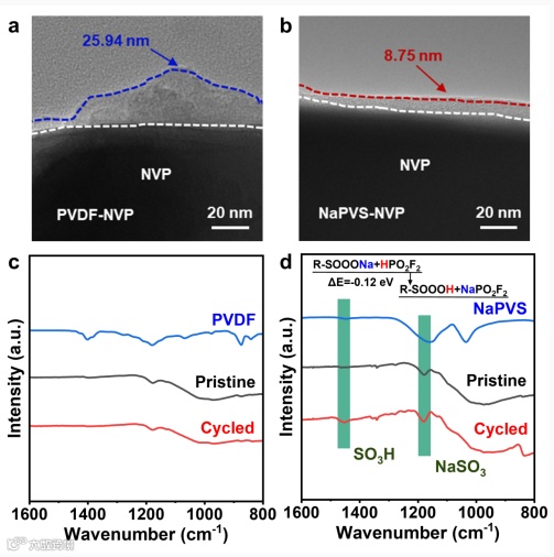 图5 (a) NVP-PVDF和(b) NVP-NaPVS电极循环150次后NVP颗粒的TEM图像;(c) NVP-PVDF和(d) NVP-NaPVS电极的FT-IR光谱(对比测试了粘结剂、原始电极及循环3次后的电极)