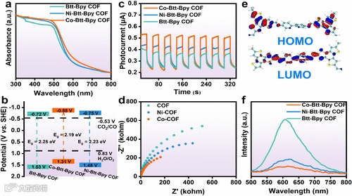 传统的光催化剂存在光生载流子复合严重和金属位点利用率低的问题,导致光催化效率低下。电子给体-受体(D-A)策略可以实现光生电子的定向迁移,是解决光生电子大量复合的有效策略。该文章Co-Btt-Bpy COF中丰富电子的苯并噻吩部分(HOMO)可将光生电子快速转移到缺电子的联吡啶基团(LUNO)中Co位点。因此,D-A COF可确保光生电子-空穴对的有效分离并促进分子内电荷转移(图3)。