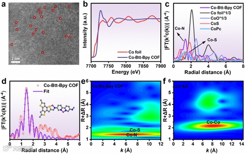 目前,大多数COF基光催化剂都只含有一种金属活性中心,因此只能进行CO2还原或者水氧化半反应。该工作利用杂原子配体可以创造独特配位环境的优势,设计出一种具有两种金属配位环境的D-A COF(图1)。Co-Btt-Bpy COF中的N-Co-N位点作为CO2还原中心,N-Co-S位点可以作为水氧化中心。通过扩展边X光吸收光谱证明了Co-Btt-Bpy COF中存在与钴酞菁(Co-N)和CoS(Co-S)相似的特征峰,但未检测到Co-Co峰,表明Co原子完全分散且有两种配位环境,即N-Co-N和N-Co-S(图2c)。