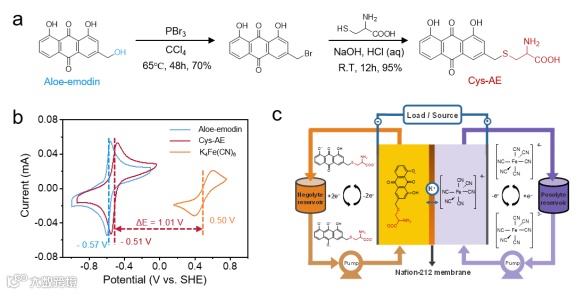 图1. Cys-AE 的合成路线及 Cys-AE‖K₄Fe(CN)₆ 水系有机氧化还原液流电池(AORFB)的示意图。(a) Cys-AE 的合成路线图。(b) 在 1.0 M KOH 溶液中芦荟大黄素、Cys-AE 和 K₄Fe(CN)₆(浓度均为 1 mM)的CV 曲)。(c) Cys-AE‖K₄Fe(CN)₆ 水系有机氧化还原液流电池的结构示意图,采用 Cys-AE 作为负极电解液(negolyte)、K₄Fe(CN)₆ 作为正极电解液(posolyte),并以 Nafion-212 膜作为隔膜。