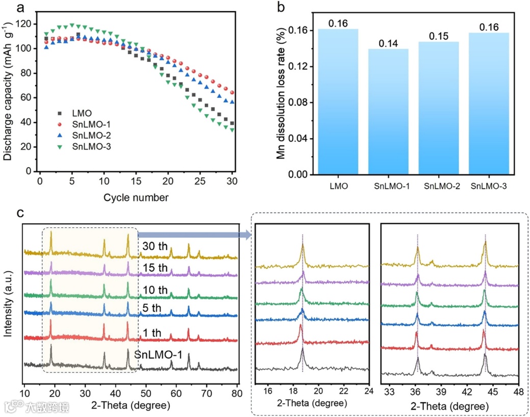 图6. LMO和SnLMO的循环性能(a)和锰溶损率(b);SnLMO-1循环过程的XRD图谱(c)