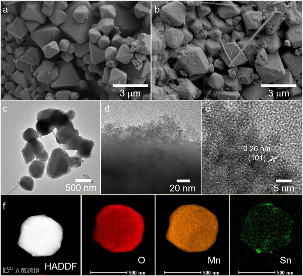 图2. LMO(a)和SnLMO-1(b)的SEM图;SnLMO-1的TEM(c和d),HRTEM(e),mapping(f)图