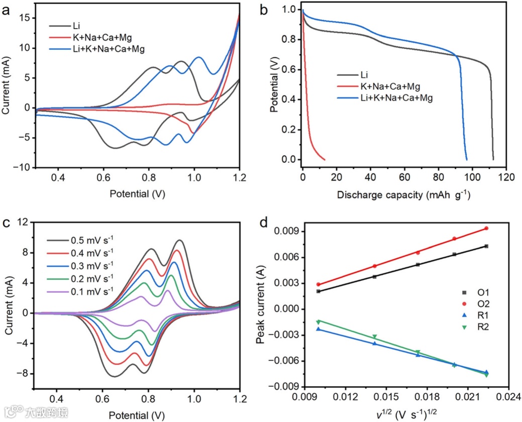 图4. SnLMO-1在不同电解液中的循环伏安曲线(a)和放电曲线(b);SnLMO-1在不同扫描速率下的循环伏安图曲线(c);v1/2与对应的氧化还原峰电流(d)呈线性关系