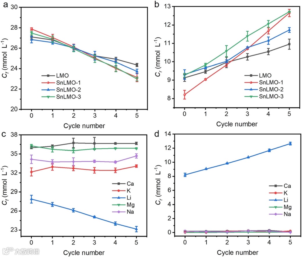 图6. 嵌入/脱嵌过程进料液(a)、相应的回收液(b)、模拟卤水(c)、相应的回收液(d)中Li+浓度变化
