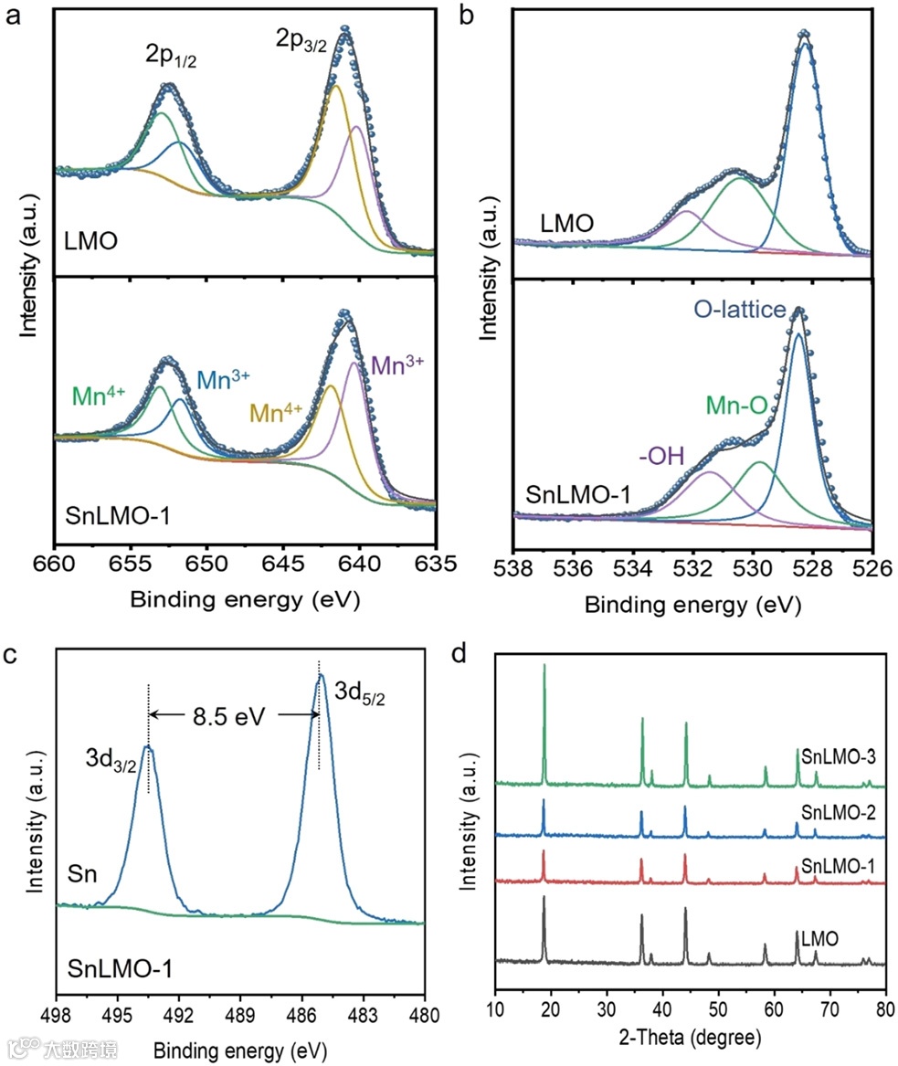 图3. LMO和SnLMO-1的Mn 2p(a),O 1s(b)和Sn 3d(c)的高分辨XPS谱;LMO和SnLMO的XRD图谱(d)